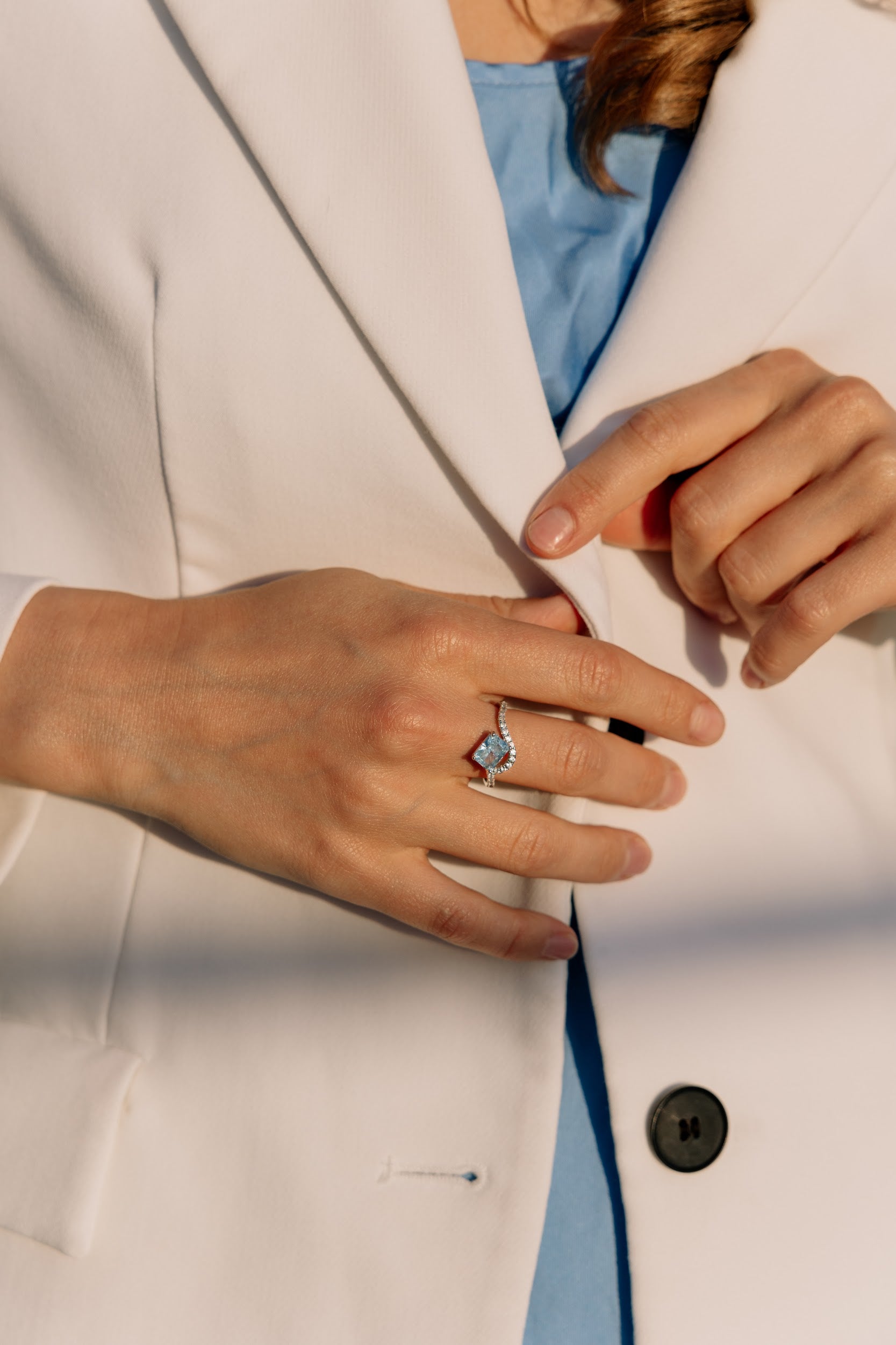 Shining like the clear blue skies over Cannes, the Allure Blue Ciel Ring features a stunning blue topaz princess cut solitaire framed by delicate white micro pave, perfect for elevating your style.